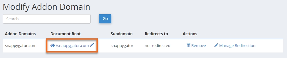 3. Locate the addon domain (or subdomain) you wish to modify.